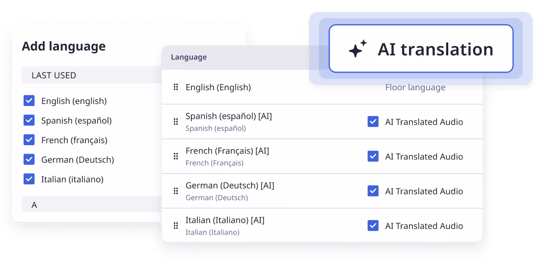 Instantly support 50+ languages using AI translation. Attendees can follow along in their preferred language via translated audio. Break down barriers and connect everyone to the conversation, in real-time.