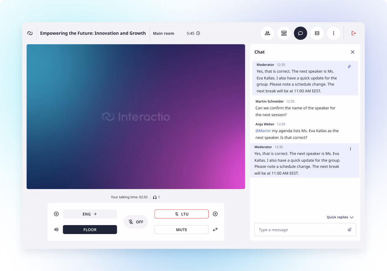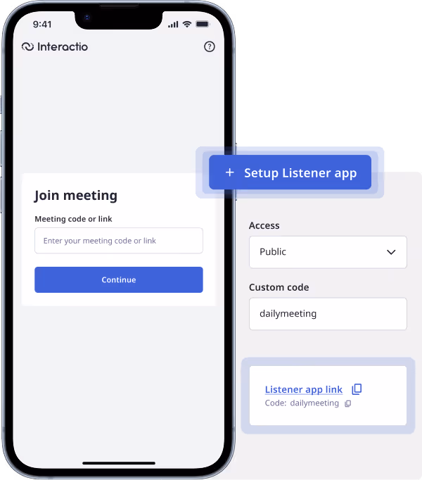 Choose your Meeting Plan and let every meeting attendee listen to translation directly through the Interactio app.